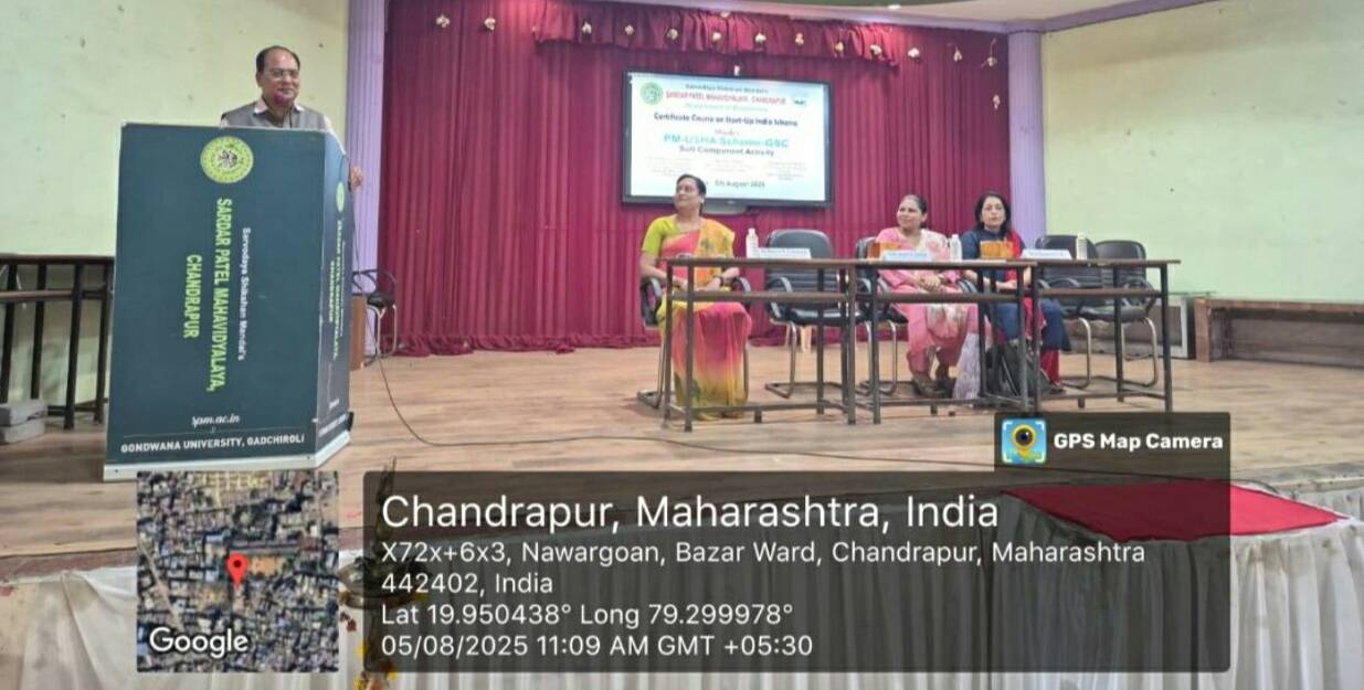 चंद्रपूर(का. प्र.): सर्वोदय शिक्षण मंडळ संचालित, सरदार पटेल महाविद्यालय चंद्रपूर, येथील अर्थशास्त्र विभागाकडून पी.एम. उषा स्कीम अंतर्गत जी. एस. सी. RUSA याद्वारे तज्ज्ञांचे विचार, ज्ञान आणि माहिती विद्यार्थ्यांना मिळावे,याकरिता “Certificate course on start up India scheme”, या विषयावर दिनांक पाच ऑगस्ट 2025 रोजी आयोजन करण्यात आले.