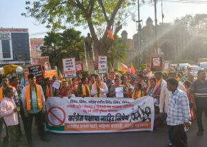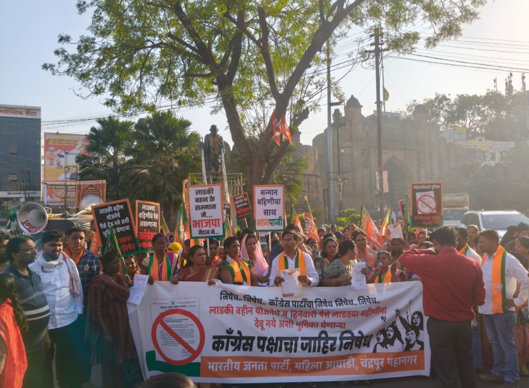 या निषेधार्थ आज भारतीय जनता पार्टी, चंद्रपूर महानगरच्या वतीने जटपुरा गेट जवळ आंदोलन करून काँग्रेसच्या महिला-विरोधी धोरणांचा तीव्र शब्दांत निषेध करण्यात आला. यावेळी काँग्रेस पक्ष महिलांच्या हक्कांवर गदा आणत असल्याचा आरोप करत लाडक्या बहिणींच्या पैशांवर डोळा टाकणाऱ्या काँग्रेसचा भाजप रस्त्यावर उतरून विरोध करेल,” असा इशारा देण्यात आला. या आंदोलनात भाजपचे पदाधिकारी, कार्यकर्ते व महिला आघाडीच्या कार्यकर्त्यांची मोठ्या संख्येने उपस्थिती होती.
