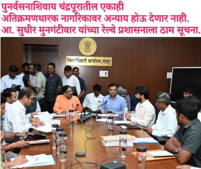 चंद्रपूर,(का. प्र.) – चंद्रपूर येथील रेल्वेलाईनलगत राहणाऱ्या अतिक्रमणधारक नागरिकांचे पुनर्वसन सुनिश्चित केल्याशिवाय कोणालाही बेघर होऊ दिले जाणार नाही, अशा ठाम सूचना राज्याचे माजी वने व सांस्कृतिक कार्य मंत्री आमदार सुधीर मुनगंटीवार यांनी दिल्या.