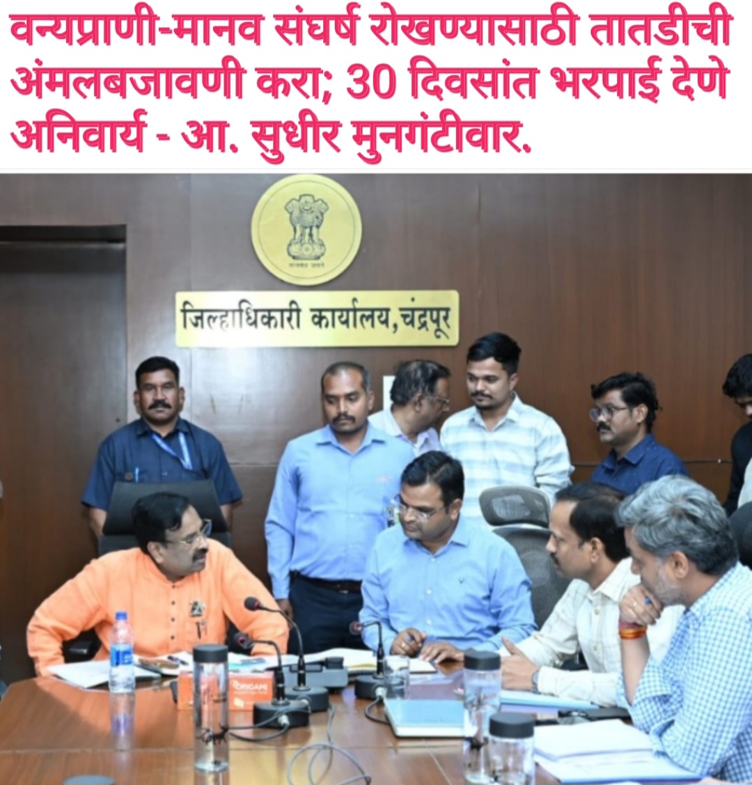 वन्यप्राणी-मानव संघर्ष रोखण्यासाठी तातडीची अंमलबजावणी करा; 30 दिवसांत भरपाई देणे अनिवार्य – आ. सुधीर मुनगंटीवार. नुकसानग्रस्तांना वेळेत मदत मिळण्यासाठी कृषी-वन विभागाची संयुक्त समिती गठित करण्याचे निर्देश. एआय तंत्रज्ञानाचा वापर, बीट गार्ड व पशुवैद्यकीय व्यवस्था वाढवण्यावर भर.