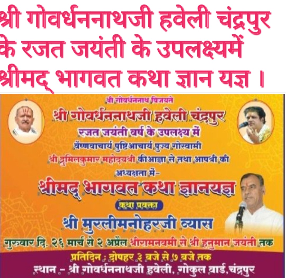 श्री गोवर्धननाथजी हवेली चंद्रपुर के अधिष्ठाता वैष्णवाचार्य पूज्यपाद गोस्वामी श्री मथुरेश्वरजी महाराजश्री के आशीर्वाद एवं वैष्णवाचार्य पूज्यपाद गोस्वामी श्री द्रुमिलकुमारजी महोदयश्री की पावन आज्ञानुसार चंद्रपुर के आध्यात्मिक चिंतक तथा साहित्यकार मुरलीमनोहर व्यास भगवान श्री गोवर्धननाथ प्रभु और गिरिराज प्रभु के सुखार्थ अपने श्रीमुखसे प्रति दिन दोपहर 3 से 7 बजे तक श्रीमद् भागवत कथा का रस पान करावेंगे।