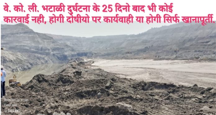 चंद्रपूर,(वि. प्र.) – दुर्गापुर वेकोलि भटाली का 11 मार्च की आधी रात के हुए दुर्घटना में भले ही जान हानि नहीं हुई, लेकिन उक्त दुर्घटना ने वेकोलि मुख्यालय, कोल इंडिया मुख्यालय, भारत सरकार की सुरक्षा संबंधित विभाग डी जी एम एस सहित तमाम सभी विभाग के दावे को झुठला दिया है कि खदानों में तय मानक अनुसार काम होता है।