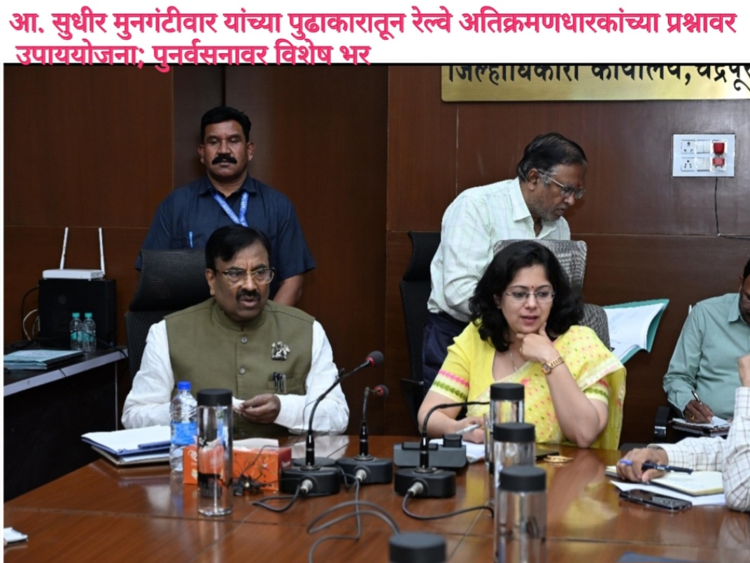 यावेळी आ. मुनगंटीवार म्हणाले की, रेल्वेच्या तिसऱ्या लाईनचे काम सुरू असून अतिक्रमणधारकांसाठी टप्प्याटप्प्याने पुनर्वसनाची स्पष्ट योजना तयार करणे आवश्यक आहे.