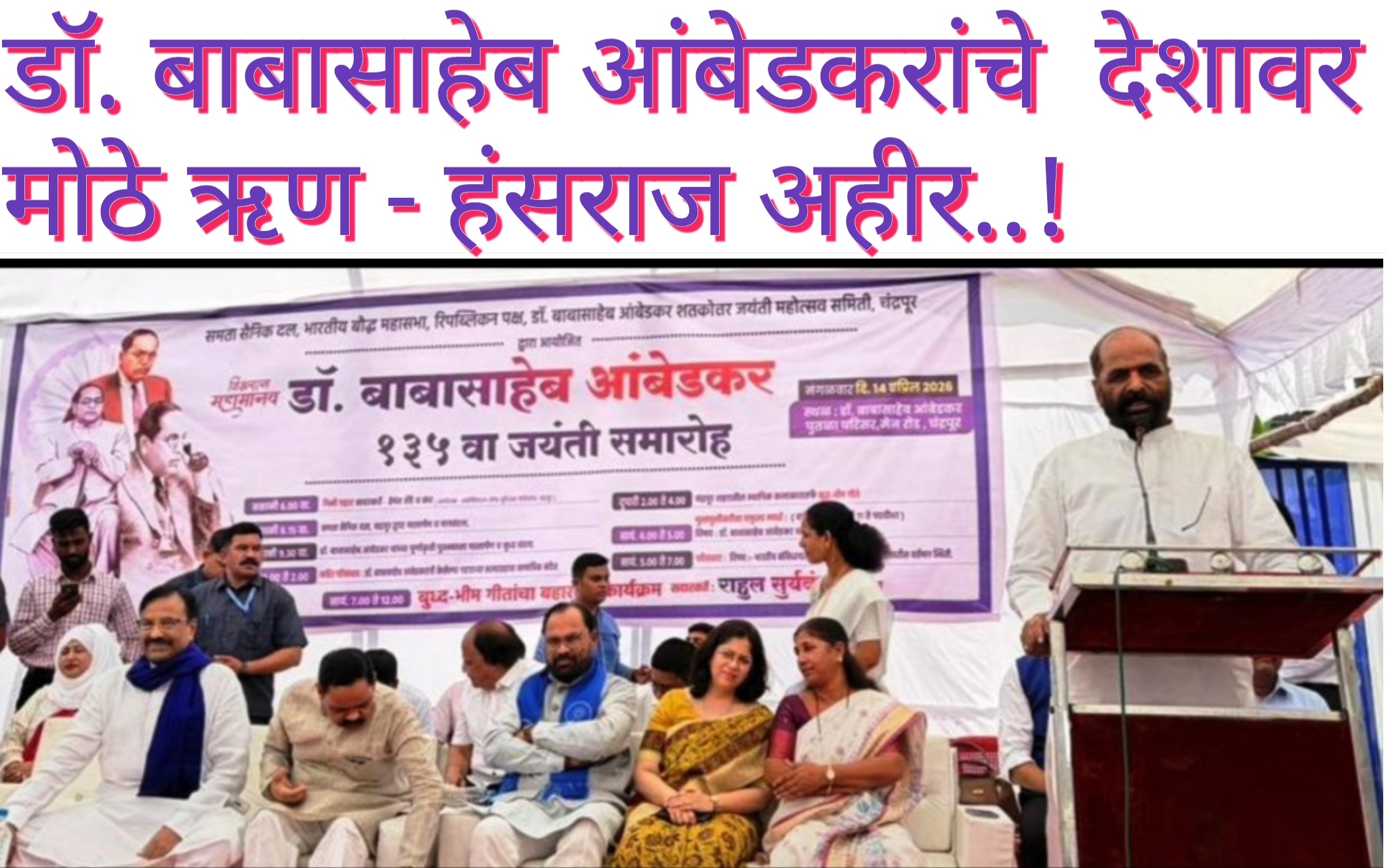 विषमतेने भरलेल्या समाजात समता, न्याय व बंधुत्वाचा स्फुलिंग चेतवण्यासाठी जीवन समर्पित करणाऱ्या या राज्यघटनेच्या शिल्पकारांच्या धगधगत्या विचारांचा वारसा समाजातील शेवटच्या व्यक्तीपर्यंत पोहोचविण्यासाठी झटणे हीच या महामानवास खरी आदरांजली ठरेल असेही हंसराज अहीर यांनी याप्रसंगी बोलतांना सांगितले. हंसराज अहीर यांनी समता सैनिक दल, भारतीय बौध्द महासभा, रिपब्लिकन पक्ष, डॉ. बाबासाहेब आंबेडकर शतकोत्तर जयंती महोत्सव समितीच्या वतीने आयोजित जयंती महोत्सवात सहभाग घेवून बाबासाहेबांच्या समाज व राष्ट्रीय योगदानावर भाष्य केले.