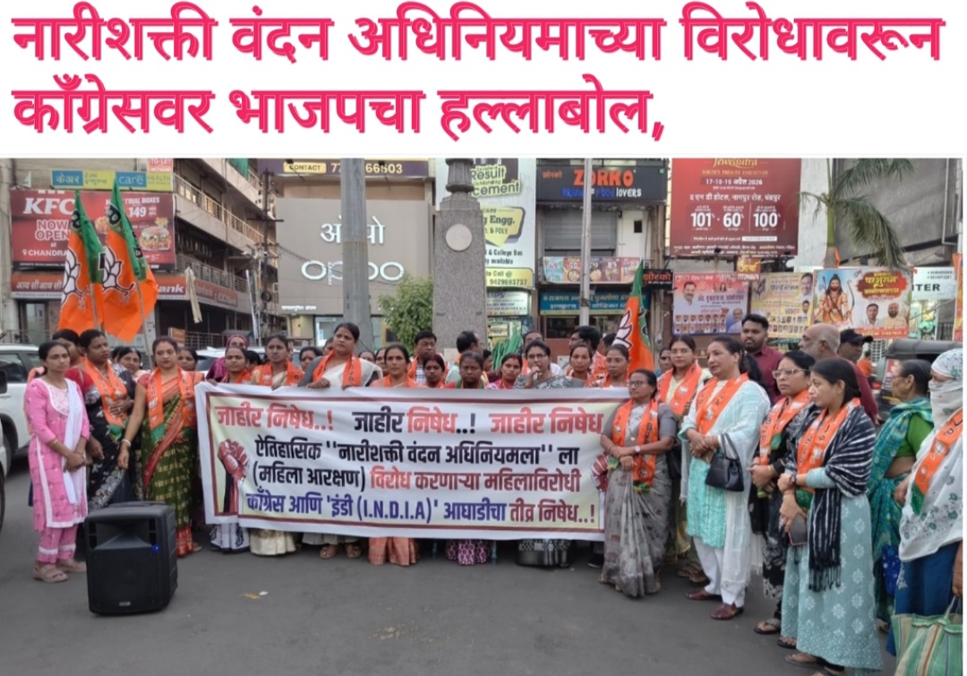 चंद्रपूर,(का.प्र.) महिला सक्षमीकरणाच्या दृष्टीने ऐतिहासिक पाऊल मानल्या जाणार्या “नारीशक्ती वंदन अधिनियम” (महिला आरक्षण विधेयक) यावरून देशातील राजकारण तापले असून, लोकसभेत काँग्रेस व ‘इंडी’ आघाडीतील काही मित्रपक्षांनी या विधेयकाला विरोध दर्शविल्याच्या पार्श्वभूमीवर भारतीय जनता पार्टीने तीव्र प्रतिक्रिया व्यक्त केली आहे. या निर्णयाचा निषेध नोंदविण्यासाठी भारतीय जनता पार्टी, महिला मोर्चा चंद्रपूर महानगरच्या वतीने आज निषेध आंदोलन करण्यात आले.