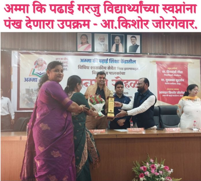 अम्मा कि पढाई गरजु विद्यार्थ्यांच्या स्वप्नांना पंख देणारा उपक्रम – आ. किशोर जोरगेवार. अम्मा की पढ़ाई शिक्षा केंद्रातील शासकीय सेवेत रुजू झालेल्या २३ विद्यार्थ्यांचा सत्कार.