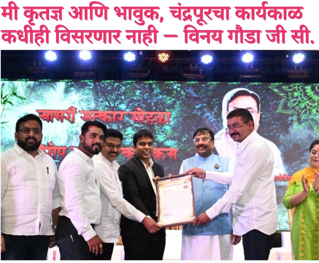 मी कृतज्ञ आणि भावुक, चंद्रपूरचा कार्यकाळ कधीही विसरणार नाही — विनय गौडा जी सी. सोन्यासारख्या अधिकाऱ्याचा सत्कार करताना आमचे हातही सोन्याचे झाले”— आ. सुधीर मुनगंटीवार. चंद्रपूर जिल्ह्याच्या विकासासाठी प्रयत्नांची शर्थ करेन : वसुमना पंत. जिल्हाधिकारी विनय गौडा आणि नव्या जिल्हाधिकारी वसुमना पंत यांचा भव्य जाहीर सत्कार संपन्न.