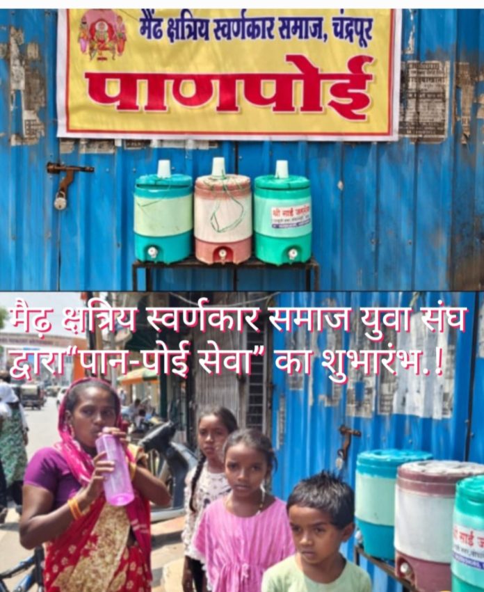 चंद्रपुर(का.प्र.): मैढ़ क्षत्रिय स्वर्णकार समाज युवा संघ, चंद्रपुर की ओर से बढ़ती गर्मी एवं 44°C तक पहुँचते तापमान को ध्यान में रखते हुए “पान-पोई सेवा” का शुभारंभ किया गया है,जिसके कारण नागरिकों ने इस उपक्रम की सराहना की है।